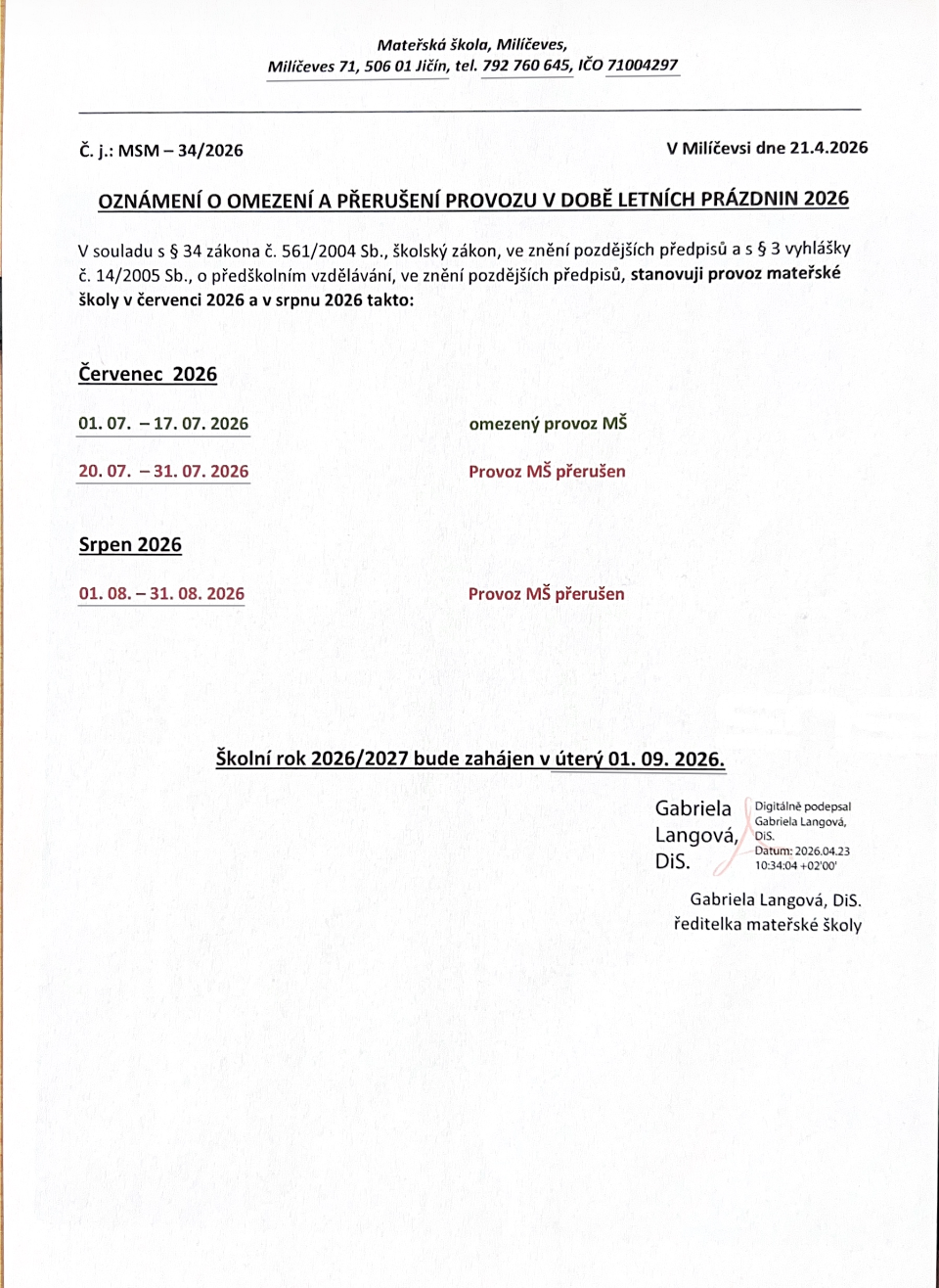Provoz během letních prázdnin