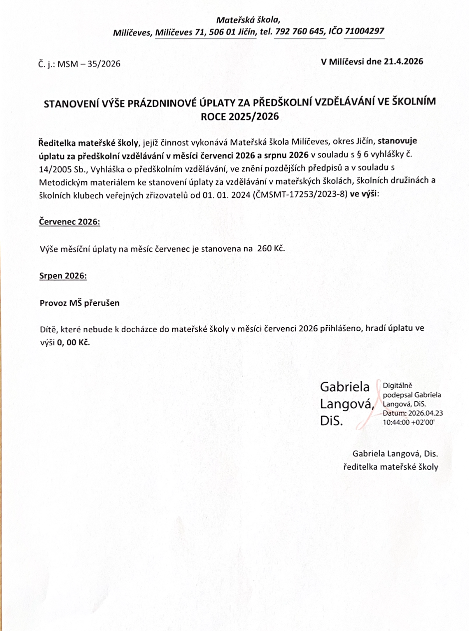 Výše prázdninové úplaty za předškolní vzdělávání